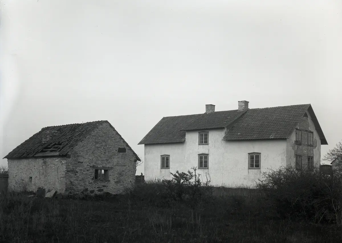 Masse har mycket medvetet tagit en bild av båda byggnaderna. Smedjan från 1800-talets första hälft är övergiven och det återanvända 1700-talsfönstret på gaveln har urfallna bågar. Den utformning manbyggnaden har på bilden är från 1870-talet. Men frågan är om den inte har ett äldre ursprung. Jakob Olofsson byggde ett stenhus 1773 som han fick 20 års skattebefrielse för. Det var förmodligen ett flistakshus med traditionell förkrymt övervåning. Ett sådant hus stämmer väldigt bra med vägghöjden här. Huset är också lite asymmetriskt, det var inte de sena 1800-talshusen, dessutom hade de sockel. Om det här är Jakob Olofssons hus, har man höjt bjälklagen, så det gått att gräva ur en källare. Man har flyttat upp och in fönstren från nära hörnen och brantat upp taket. Sådana här ombyggnader var vanliga.
