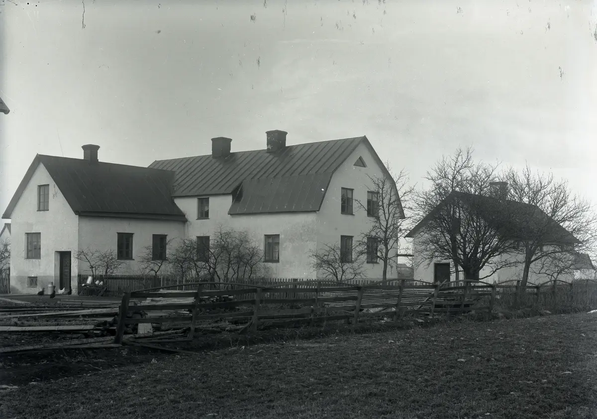 Här ser vi manbyggnadens baksida med det rätt nya köksbakbygget med vardagsingång. De tidigare spåntaken har täckts med papp. Till höger syns flygeln, vars baksida mot norr är blind.