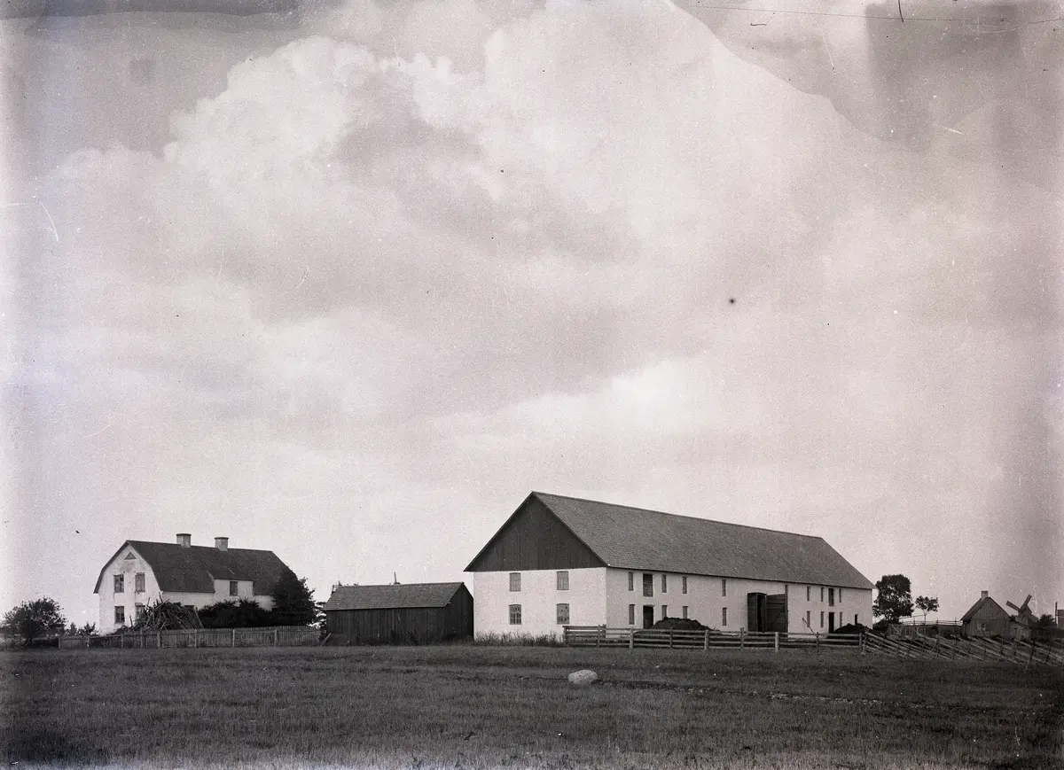 På bilden ser vi gårdsparten från åkern i sydost. Manbyggnaden har ännu inte fått sitt bakbygge. Bilden domineras av den stora ladugården i sten med högt foderloft och många spröjsade fönster, som här bara är ett par år gammal. Den innehöll fähus vid varje ände och lada i mitten. När man slutade med korna 1947 byggde man successivt om ladugården till lagerhus för den grönsaks-, frukt- och bärodling man gick över till. Till vänster står en liten vedbod i resvirke under spåntak.