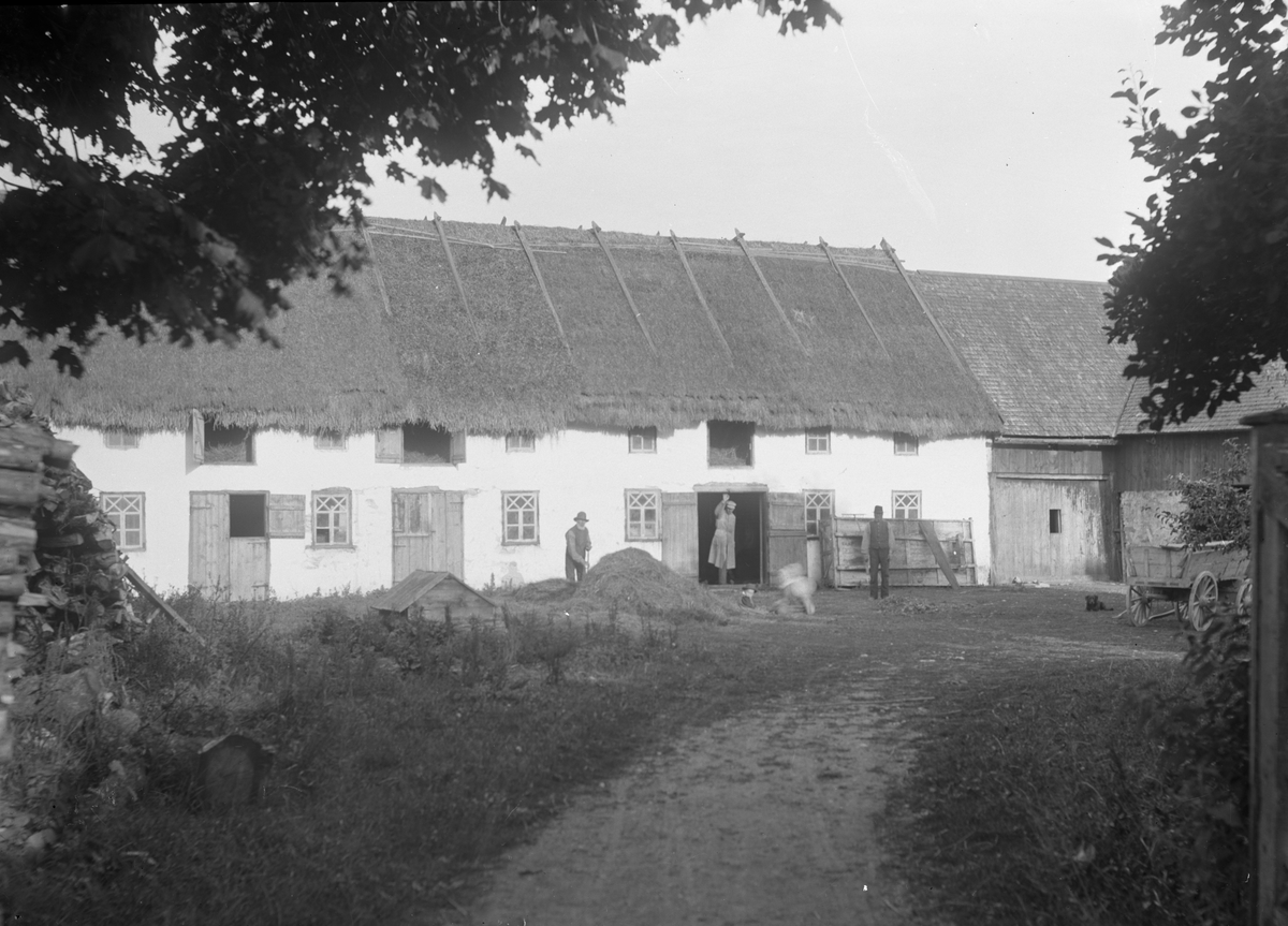 Masse skriver "gamblä häusi", men det här är inte så gammalt! Visserligen kan det vara en äldre stenladugård, men som rätt nyligen moderniserats med foderloft och en mängd spröjsade fönster och många dörrar och luckor. T h syns porten till ladan med en vädringslucka öppen, samt tröskhuset. Dessa byggnader är nog äldre än ladugården.