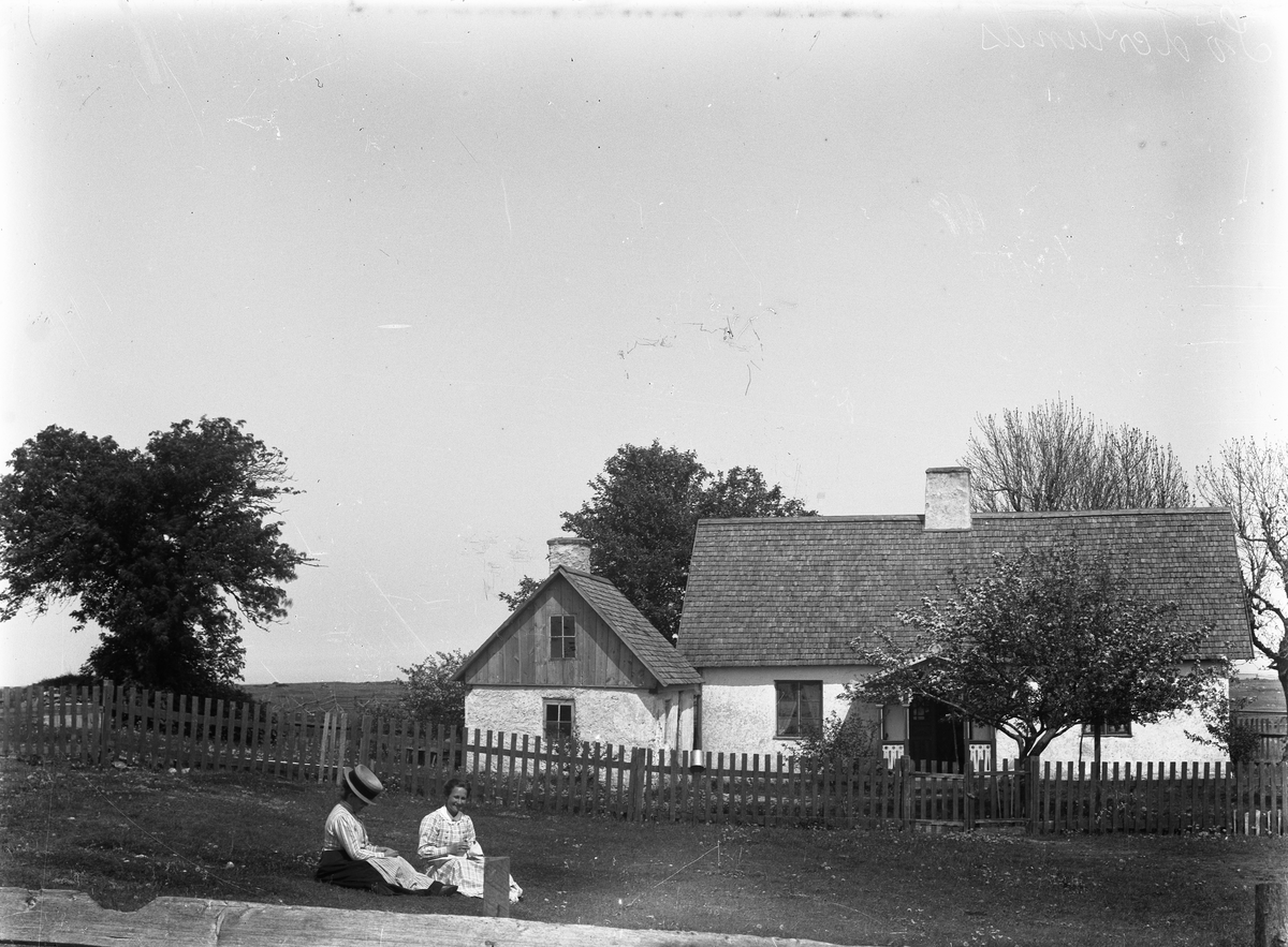 Masse har tagit en försommarbild av idyllen hos Söderlunds. Masses fru Majken och ena dotter Maja sitter i gräset på gårdsplanen framför staketet till lillgården. Manbyggnaden och brygghuset ser prydliga ut, båda med rätt nya spåntak och vitkalkade väggar.