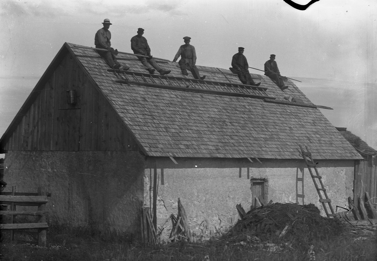 Här har man lagt spåntaket nästan färdigt och det ser ut som an har gjort ny locklistpanel på gavelfältet också. Man har slagit några spikar i taket och lagt stegen emot, så man har nåt stöd att stå mot. Vilka gubbarna är går inte att se.