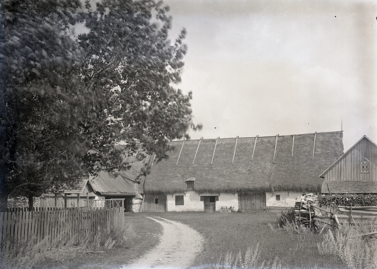 Masse har stått vid gårdens infart och tagit denna bild av ladugården. Den har agtak i gott skick och man kan undra om man verkligen redan 4 år efter det att denna bild togs byggde om den? Men Bild 1091 visar dess nya utseende, så någon gång före dess måste det ha skett. Om man ser på ladugården på denna bild och jämför med Bild 1089, så är det säkerligen samma ladugård. Man bara rev agtaket och höjde väggarna med ett foderloft, satte i moderna fönster osv. T ex blev hoimdluckan närmast ladporten ett fönster och dörrarna mitt mellan fähusen lät man sitta kvar. Ladugårdsflygeln t h stod redan 1906, vilket förklarar att den är äldre än ladugårdens ombyggnad och fått lappat spåntak 1914, se Bild 1091. Här hade man nog vedbod på gavdeln, men det finns vedstaplar t v också.