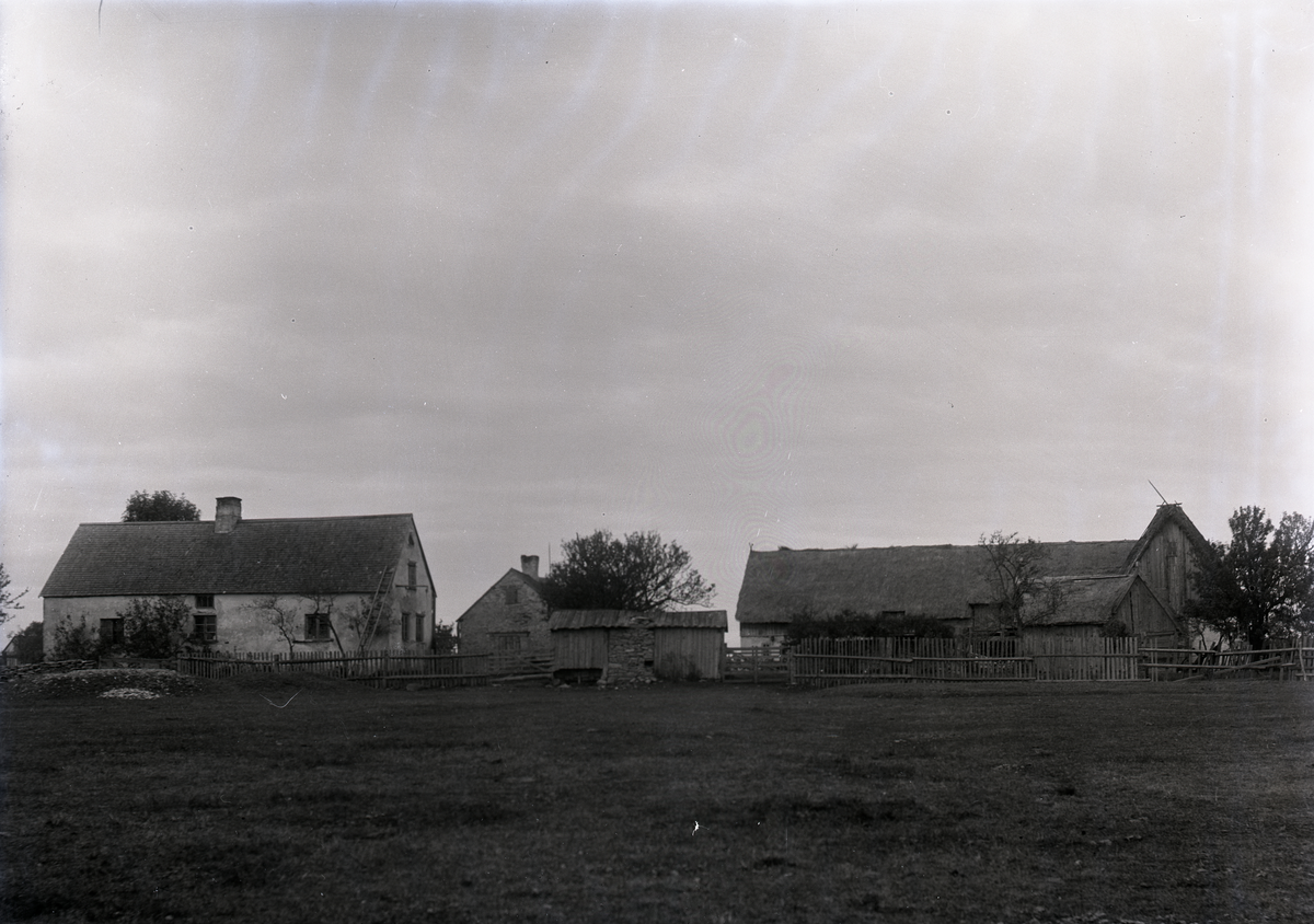 Här ser vi hela gårdsparten öster ifrån. Masse har stått alldeles utanför änget som ännu finns kvar och tagit denna bild så man ser alla byggnaderna. Manbyggnaden har ett litet fönster uppe under taket. Det visar som flera andra hus i socknen att manbyggnaden ursprunligen var ett flistakshus med högre långväggar. Dessa sänktes och den sten man fick över byggde man på gavelspetsarna med, så man fick ett modernt brant tak, se t ex Bild 569. Det ligger en stenhög och finns en stenmur på vänstra sidan om huset. Det borde betyda att här stått ett hus tidigare, men när är osäkert.