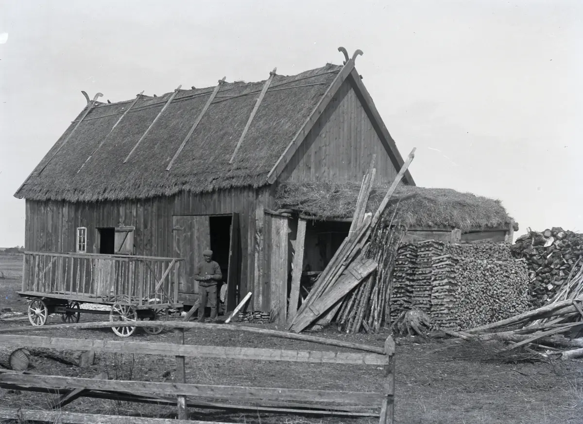 Vi ser Dahlbys lilla ladugård, byggd i resvirke med halmtak. Den är nog inte mer än max 15 år gammal. Till vänster var det fähus och till höger lada, egentligen diverseutrymme. Höhäcken tyder på att man höll häst. Skjulet till höger var en udda byggnad med ett platt tak täckt med halm, det kunde knappast ha varit särskilt tätt. åtminstone gaveln mot vedtravarna ser ut att ha varit en bulvägg, kanske också baksidan, medan framsidan var öppen. Den fungerade nog som vedbod eller allmänt förråd. Ordentligt med ved har man samlat på sig, delvis ovanligt fint staplad. I dörren står sannolikt Hans Dahlby 51 år.