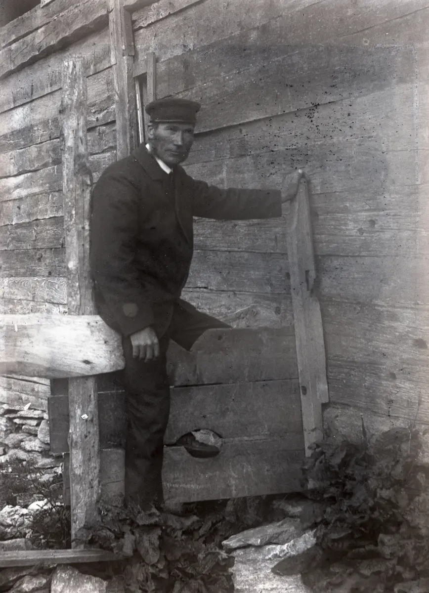 En finklädd Fäi-Jakå kliver över något vid en ladugårdsvägg, oklart vad och var?