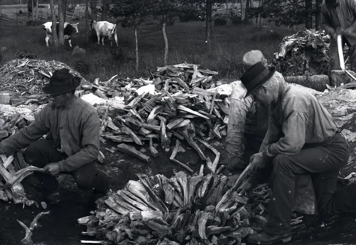 Sunnkörke Karl Karlsson (KAN MASSE HA TAGIT FEL GÅRD; ATT DET SKALL VARA GANNOR I STÄLLET?) har just börjat sätta in tjärvedsbitarna i soidet. Man lägger bitarna i ringar, kallade kransar, så att tjäran så lätt som möjligt skall rinna ur dem. Man har smaitet, finhuggit, massor av tjärved, det gick ofta åt 10 kubikmeter i ett normalstort soide.