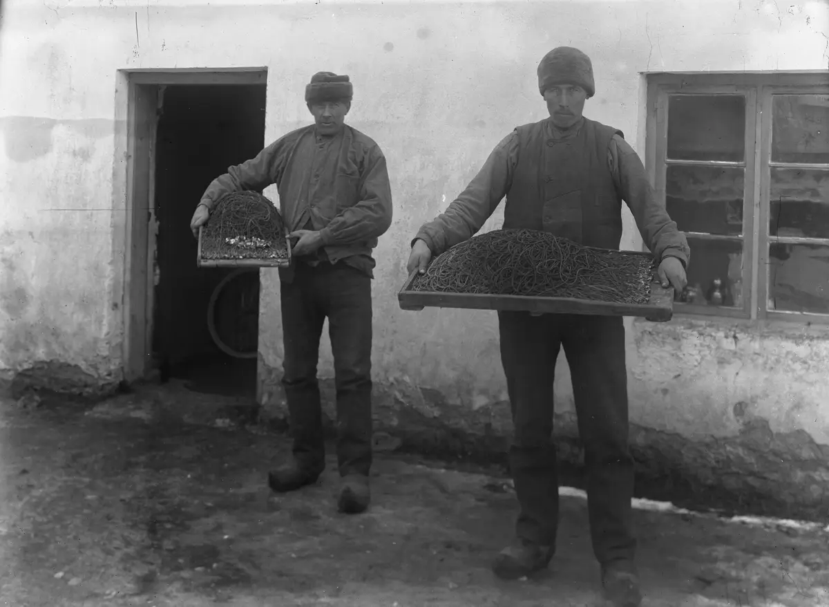 Hallsarve Hans Karlsson, 59 år, och sonen Vilhelm, 32 år, skall ut på vinterfiske med långrev efter torsk. Reven är betad och upplagd ordentligt på anglekimbarna. Det är gott vinterväder utan snö, de har pälsmössar men är barhänta, Vilhelm har storväst medan Hans bara har blus. Båda har hemgjorda träskor.