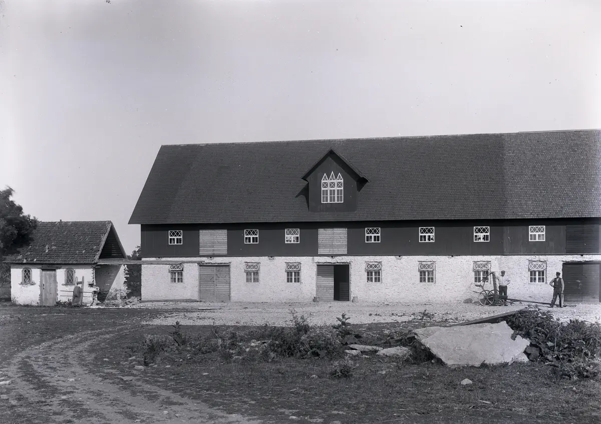 Den nya ladugården är klar, man håller bara på och målar andra strykningen, se skarven mitt på! Den långa längan innehöll alla fähusen och den vinklade delen var ladan. Konstfärdiga fönster uppe i gavelspetsarna var omtyckt. Av bodlängan, som heller inte var gammal, återstår bara en stump och av den gamla ladugården finns ingenting kvar.