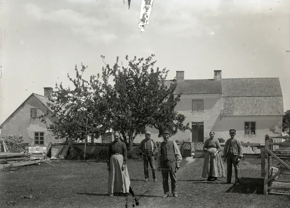 På bilden ser vi från vänster Margareta Hejdenberg 37 år, möjligen en bror till Frans, därefter Margaretas svärfar Olof Hejdenberg, svärmodern Maria Hejdenberg och maken Frans Hejdenberg 33 år. De är vardagsklädda, men Margareta har nog lite finare kläder på sig.