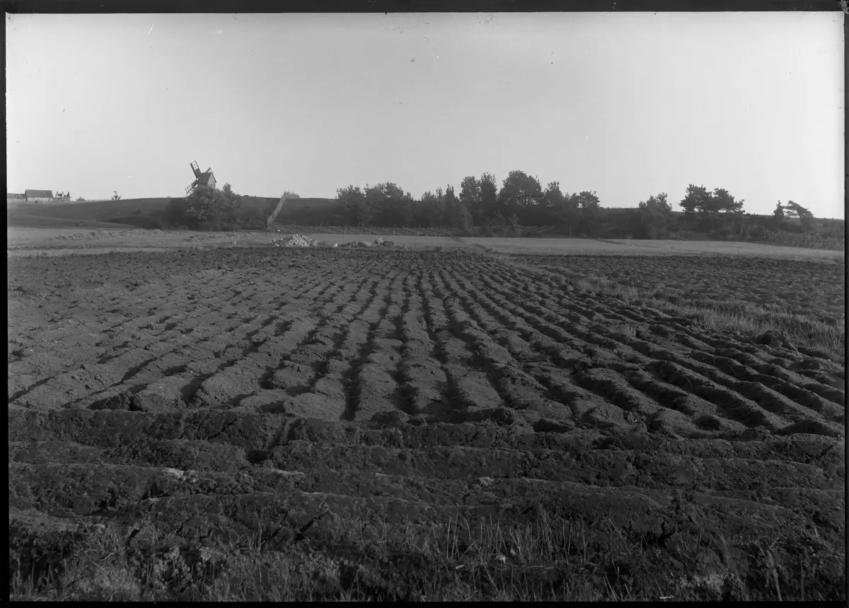 Här visas en nyplöjd åker där man använt vändplog, där motvändningen ännu inte är gjord. T h syns en s k räcktun med två räckar. Sådana tunar hade man där det var lågt betestryck med tex kvigor.