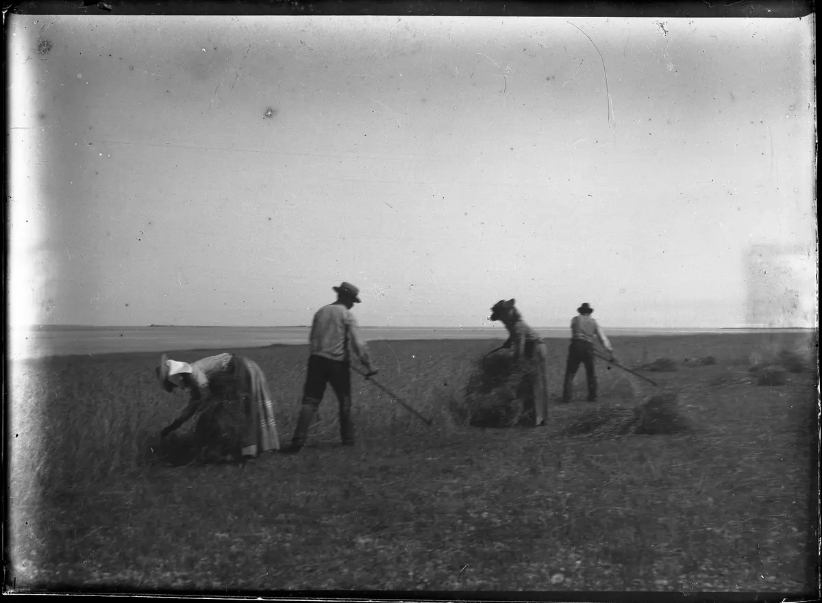 Fäi-Jakås familj skär råg på en mager åker nere vid stranden. Avkastningen verkar ganska skral, se hur få skupar det blivit. Den ännu stående rågen ser också rätt gles ut. Kanske har det varit torrsommar.