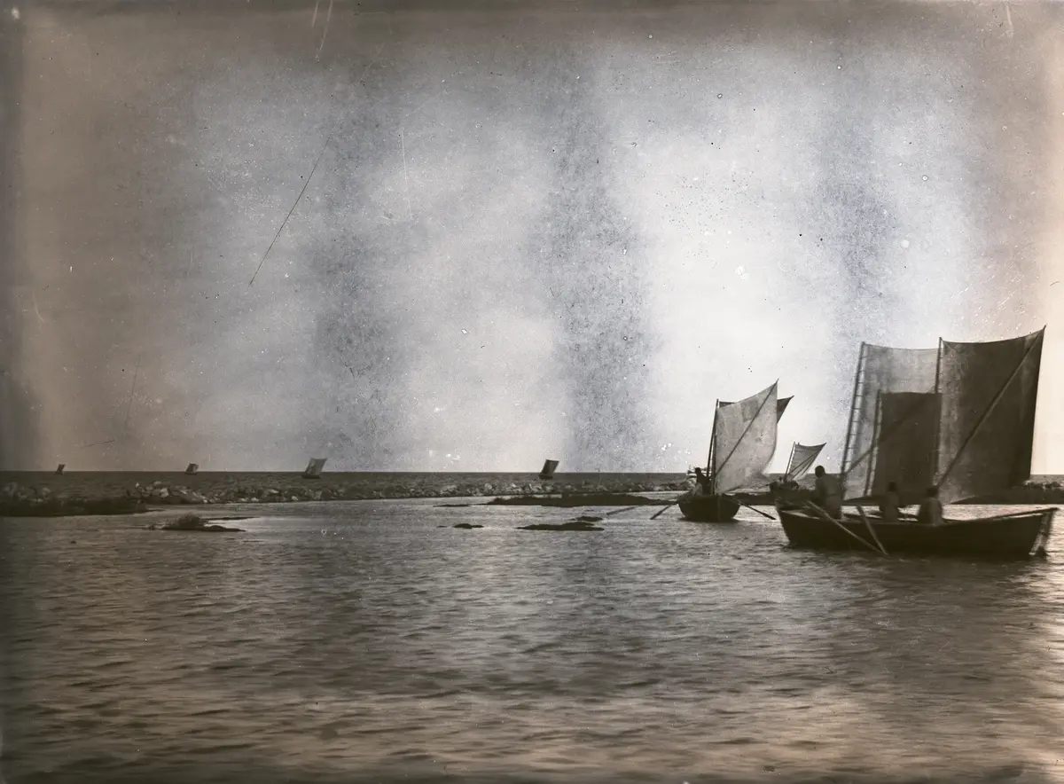 En liten armada av små seglande allmogebåtar ger sig ut på kvällen för nattens fiske. Seglen är satta och man ror ut ur hamnen. 8 båtlag syns på bilden, en vy som sedan länge är borta.