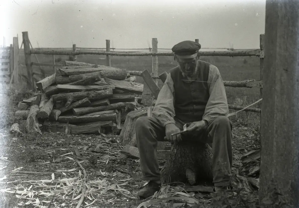 Bakom honom skymtar sågbocken och en låg mycket använd huggpacke, huggkubb, samt en hög floved.