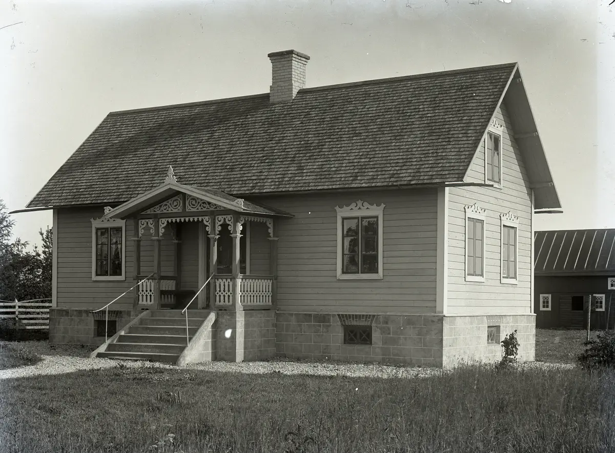 Manbyggnaden bestod troligen av farstu med bakomliggande kammare, sal t h och vardagsstuga t v, med kök i bakbygget. Huset vänder sin framsida mot vägen vilket blev vanligt vid 1800-talets slut. Här finns den inbjudande trappan upp till den eleganta snickarglädjeverandan, dit gästerna skulle gå, men som aldrig användes till vardags. Huset står på en hög sockel putsad i blockimitation, vilken bildar en källare, vilket var brukligt att bygga vid denna tid. Husets fasader är klädda med liggande hyvlad panel. Fönstren har foder med dekorativ utformning upptill. Husets skorstenar går ihop till en uppe på vinden och skorstenstoppen är murad i det moderna materialet silikattegel. Taket är spåntäckt, vilket är typiskt för tiden kring förra sekelskiftet.