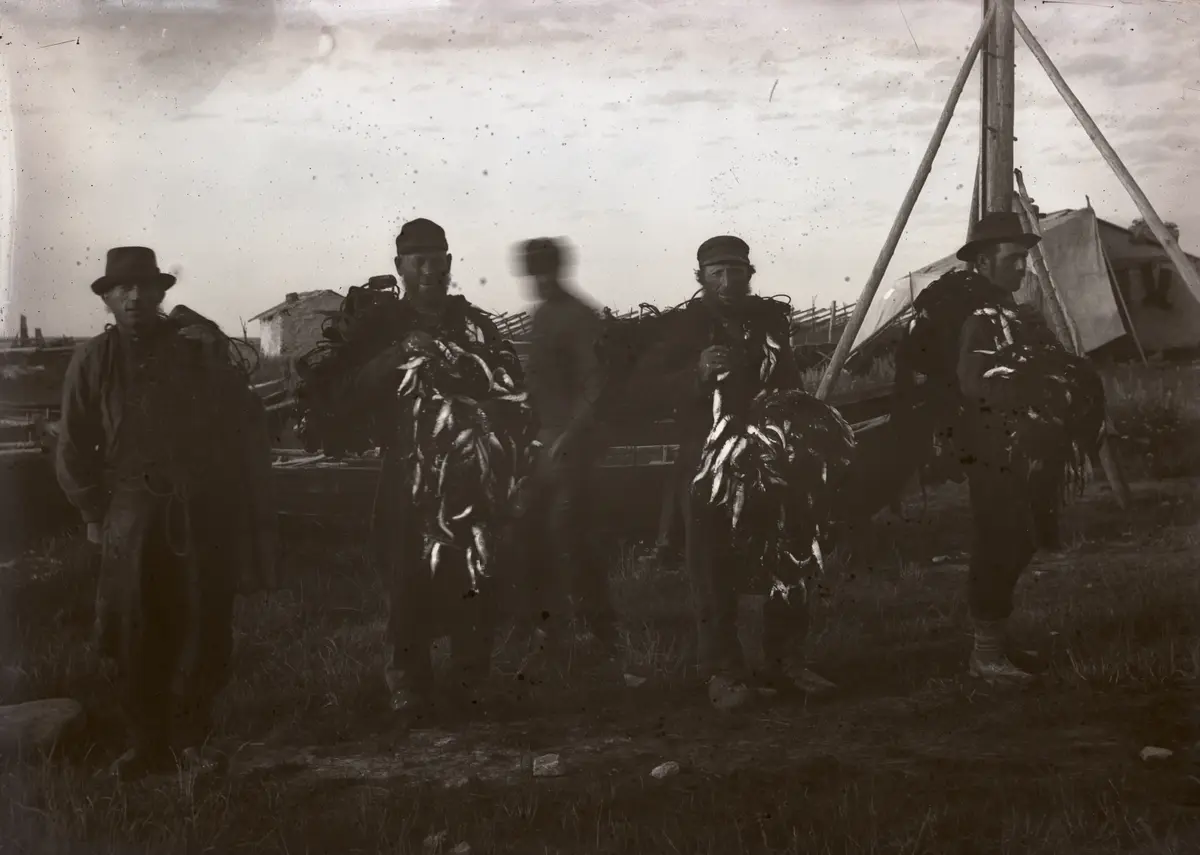 Nattens fiske har varit lyckat och här bär man upp strömmingsgarnen från båten. De två vänstra karlarna har skinnförkläden för att skydda kläderna från blöta, det var rätt vanligt att ha skinnförkläden.
