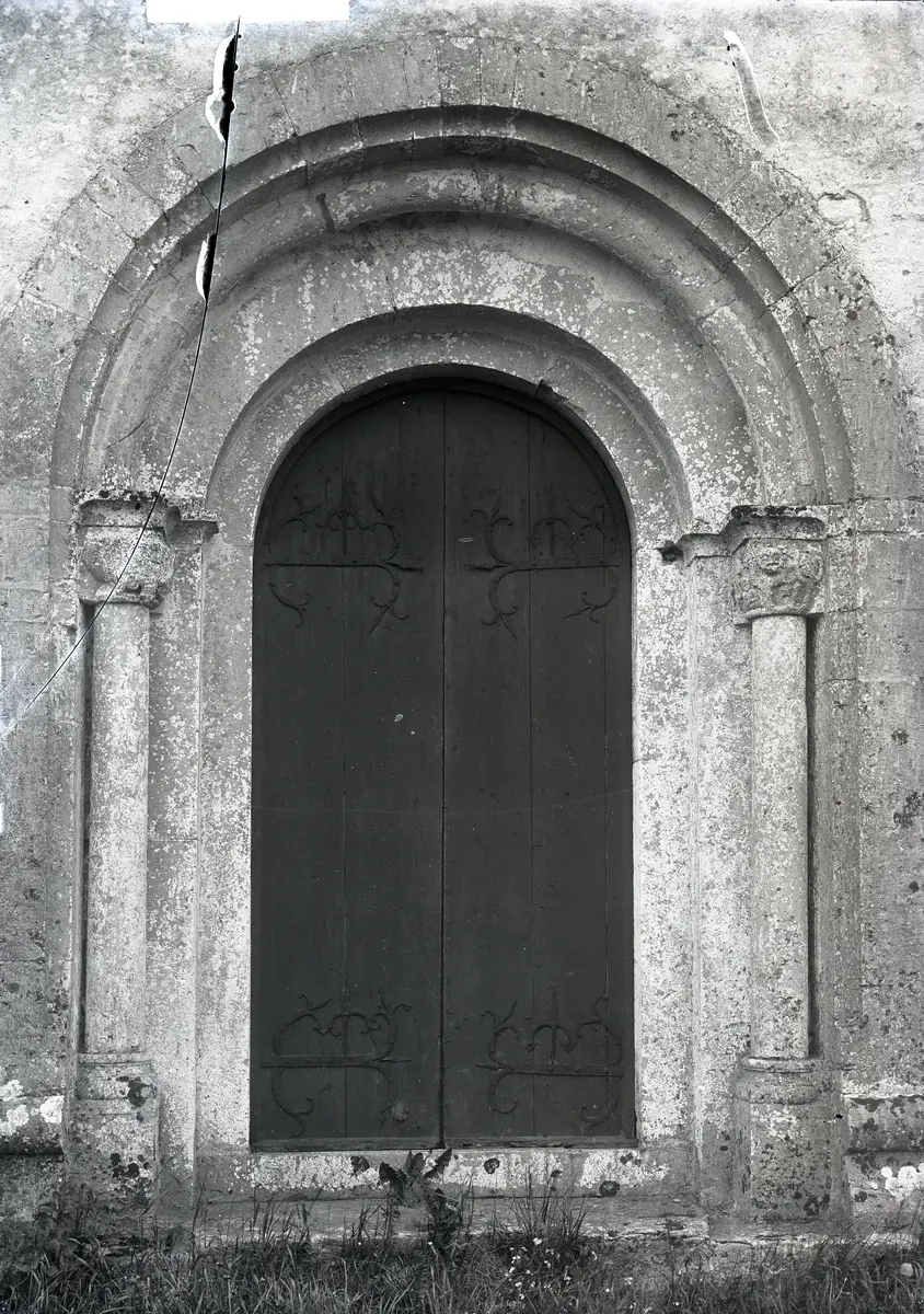 Porten är romanskt rundbågig med ett s k språng med kolonetter, vilka står på baser i form av urnor. Ovanför kolonetterna sitter reliefhuggna kapitäl. Det östra är prytt med en huggen örn som biter i vulsten den står på. Det västra kapitälet är mycket inttressant. Det avbildar t v det gotländska lammet med korsfanan. Lammet har uppåtstående horn, vilket visar att det är en tacka. Tackan är symbol för evigheten eftersom det är kvinnan som för livet vidare. Lammet betecknar också den kristna församlingen och är symbol för det Goda. T h avbildas belätet, symbolen för det Onda. Mitt emellan sitter den lilla ängsliga människan med händerna för bröstet och odjurets klofösedda tass över huvudet och vet inte vilken makt hon skall välja!