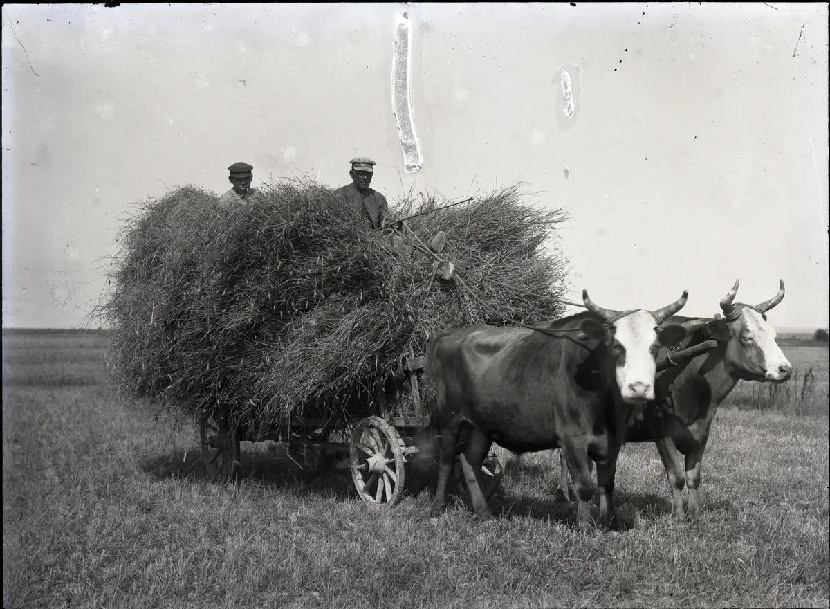 Man kan tänka sig att Hallsarve Hans och Arvid Karlsson är nöjda nu när de kan köra hem råglasset, skörden är bärgad! Fadern Hans styr stutarna, Arvid är troligen ännu för ung för att anförtros en sådan uppgift. Stutarna är ovanligt mörka, men de vita huvudena och de stora hornen är rastypiska. Se även bild nr 55, 56 och 57.