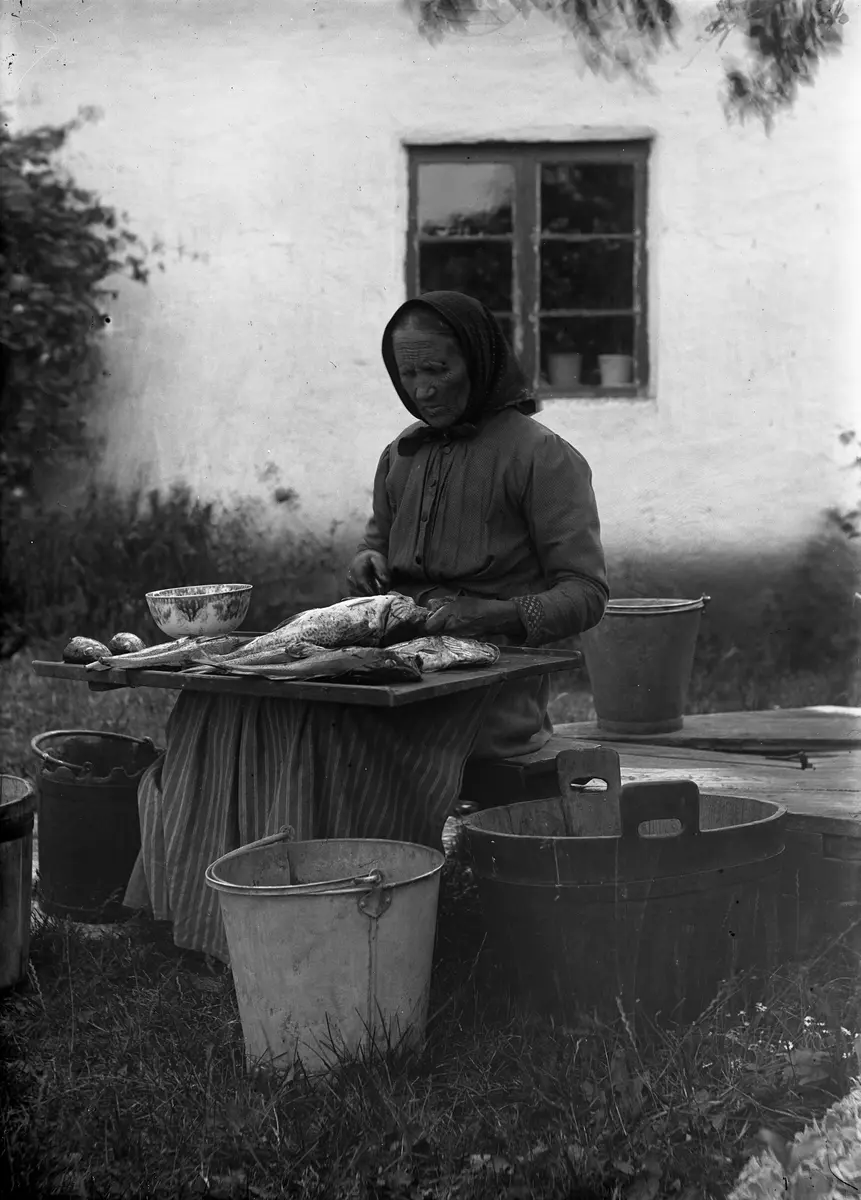 Torsk skulle man traditionellt bara fiska i månader med "r" i, men här har man fiskat dem mitt i sommaren! Fie Anna Catarina Andersdotter Laurin, 71 år, sitter med brickan i knäet och skär huvudena, fenorna och inälvorna ur torsken. Huvudena togs till vara och fylldes med levrarna och kokades till nationalrätten "tåskbåddar". Även kroppen koktes ofta, småtorsk stekes, liksom filéer, men det var inte lika vanligt. Det ser lite vådligt ut med porslinsskålen balanserande på kanten, men i den la Ann-Kaisä säkerligen levrarna. Hon har många kärl omkring sig, så fångsten har nog varit god. Ann-Kaisä har vanliga arbetskläder och den sedvanliga duken på huvudet.