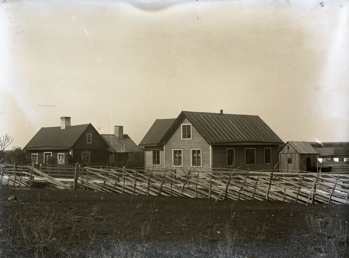 Masse har gått in på åkern och tagit denna bild av Anton, inte August, Hallgrens bostadshus till vänster och Arvid Södergrens till höger. Hallgrens hus är ett gammalt inpanelat bulhus, bestående av ett rum på var sida om skorstenen, en sk ofullständig parstuga. På framsidan fanns en liten farstu och bakom skorstenen ett fd obetydligt kök. För att få ett bättre kök har man gjort ett bakbygge bakom vardagsstugan, bakbygget innehöll säkert också ett brygghus längst ut på gaveln.