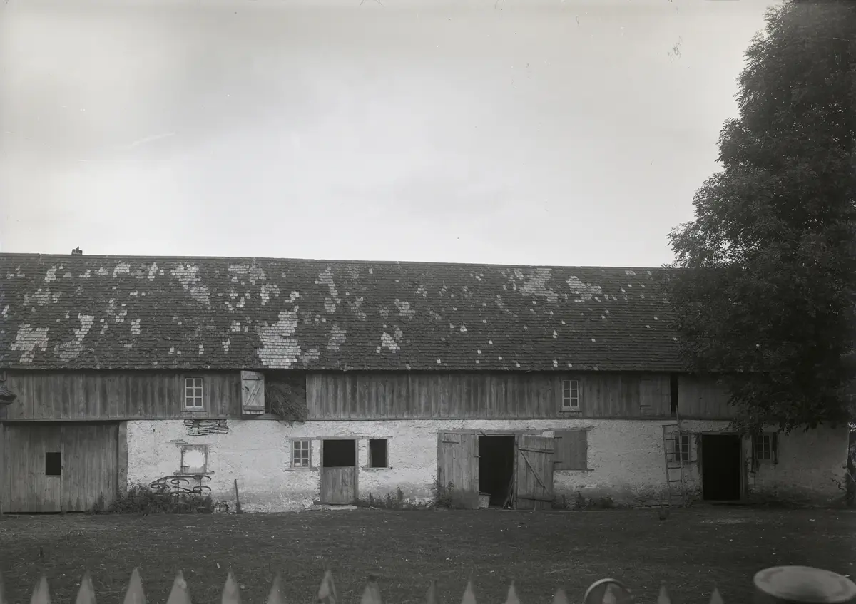 Ladugården innehöll lada längst till vänster, bara ladportarna är med här. Därefter följer en hoimd, luckan syns i väggen ovanför fjäderharven, och tillhörande kohus. I mitten med dubbeldörrarna var det nog stall med hoimd till höger. Längst till höger var det kanske ungnötshus, grishus mm.