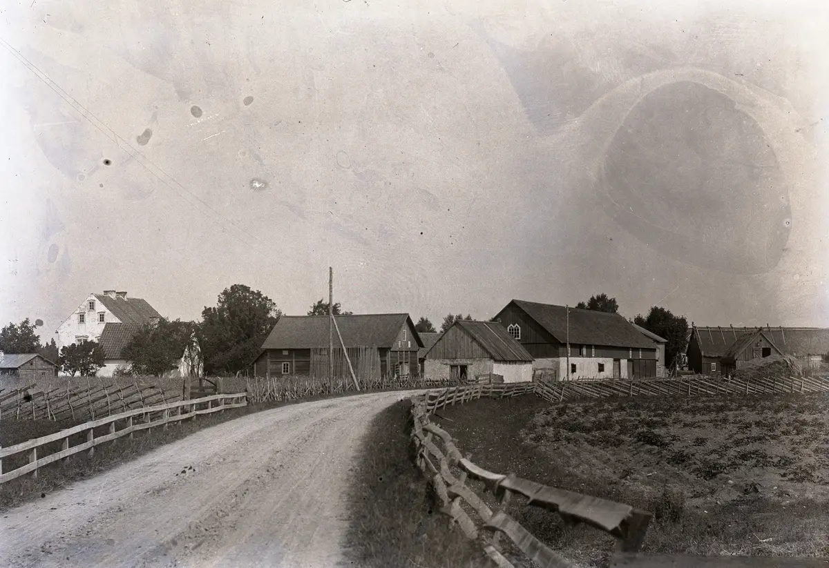 Masse har tagit en fin överblicksbild av Husarve från stora landsvägen. Från vänster ser vi gårdens smedja i bulteknik, därefter manbyggnaden, brygghusflygeln, bulmagasinet, grishuset och sist ladugården, vars fähusdel är i sten och laddel i bulteknik, något som var ganska vanligt. På ladans gavel skymtar något bygge, som inte finns kvar idag. Längst till höger ser man lite av uthusbyggnaderna på Bönde Olssons och Hults, se Bild 695-702. Vi ser också tunarna i landskapet och att man delvis har börjat med slantunar av sågat virke längs med landsvägen.