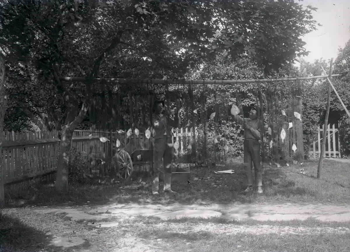 Flundrenätet är upphängt på en stång i trädgården och Hallsarve Hans Karlsson och sonen Arvid plockar flundror, vilka delvis lyser med sina vita undersidor. Fångsten är ganska liten.
