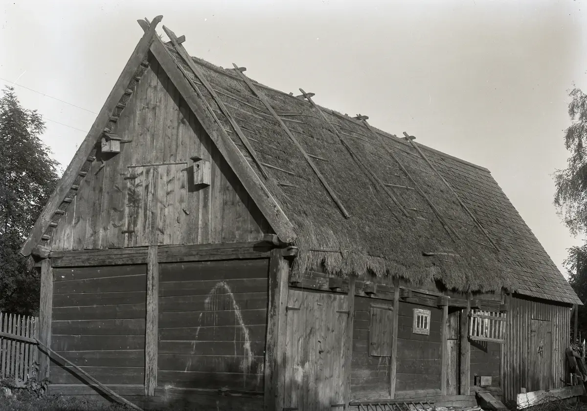 Denna vackra lilla bulladugård med halmtak kan vara byggd omkring 1865 när detta ställe etablerades. Den har senare byggts till med en lada i resvirke under spåntak. Bakom porten hitåt kan det ursprungligen ha varit en liten lada, senare troligen vagnbod. Därefter följer en hoimd och sedan ett dubbelt fähus och längst bort den nya ladan. 1946 revs denna ladugård bort och man byggde en ny större nere bakom bostadshuset.