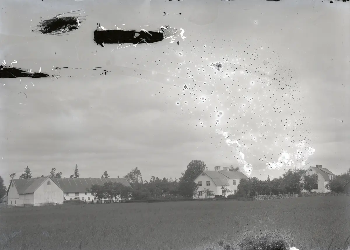 Masse har tagit en intressant överblicksbild av Böndes västra parter. Till vänster ser vi Lars Petterssons part med den alldeles nybyggda ladugården och manbyggnaden som syntes på Bild 684. T h ser vi Lars Johanssons manbyggnad, som revs strax efter denna bild togs. Dessa två manbyggnader samt Reinhold Levanders, som ligger alldeles th utanför bild, är påfallande lika varandra. Man har säkerligen hjälpt varandra att bygga, men varifrån fick man intrycken till stilen?