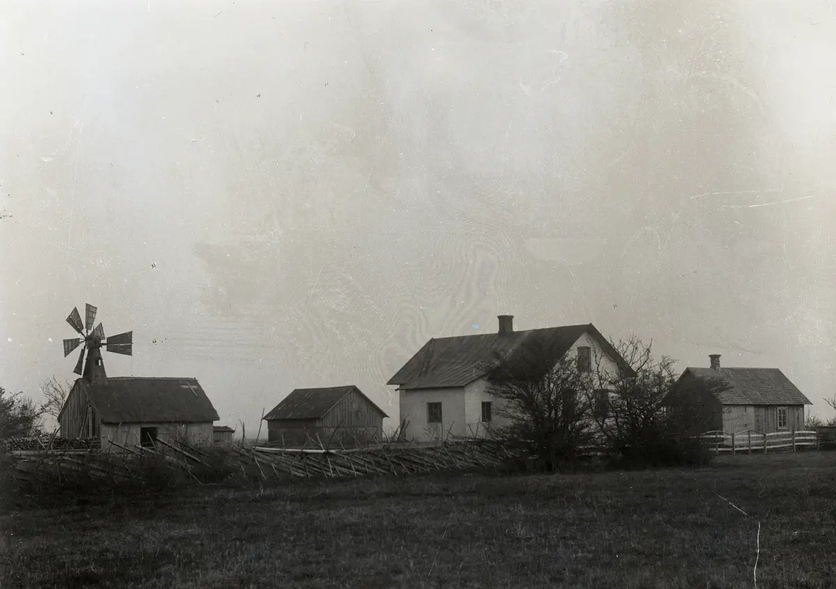 En vårkväll har masse gått ner och tagit denna härliga bild av Olssons ställe. I bildens mitt ser vi bostadshuset med vardagsfarstun och till höger Oles snickarbod. Till vänster står en äldre bod, kanske i bulteknik, något höjd i senare tid och försedd med spåntak, okänt vad den använts till. Längst till vänster står ladugården med fähus i den högra delen och lada i den vänstra. Här har Ole byggt en väderkvarn av märkligt slag! Kvarnen har en hätta som automatiskt vrider upp sig i vind med hjälp av den åt höger utstickande vindhästen. 6 vingar är helt unikt. Det finns en klar likhet med Södergrens kvarn och frågan är vem som har påverkats av vem, eller om det var Ole som rentav byggde båda, se Bild 614. Till höger om ladugården står en liten bod.