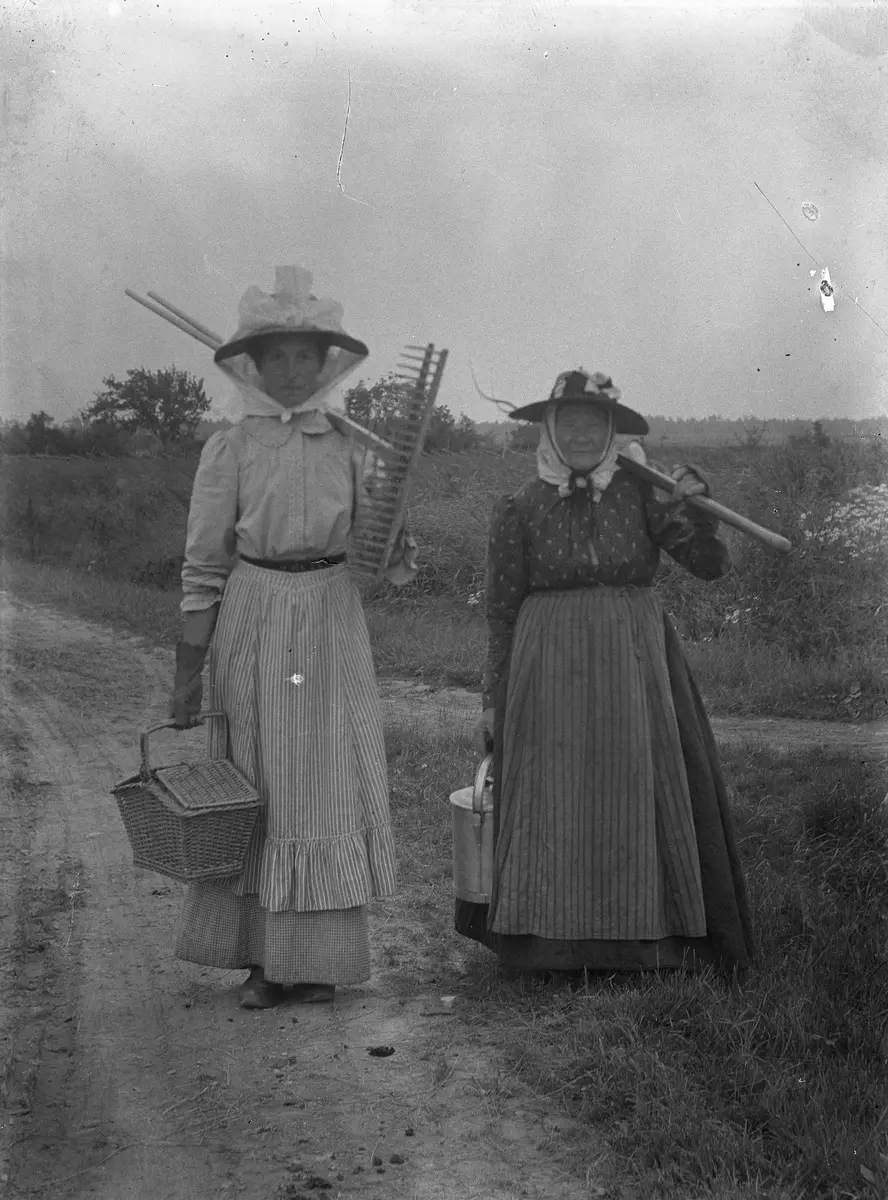 Kvinnorna skall iväg och räfsa ihop det gräs slåtterkarlarna slår. De är fint klädda med stora hattar. De har med sig två räivar, räfsor och en gaffel, samt korg med mat. Vad den blanka (?) saken är för något har ännu inte gått att utröna.