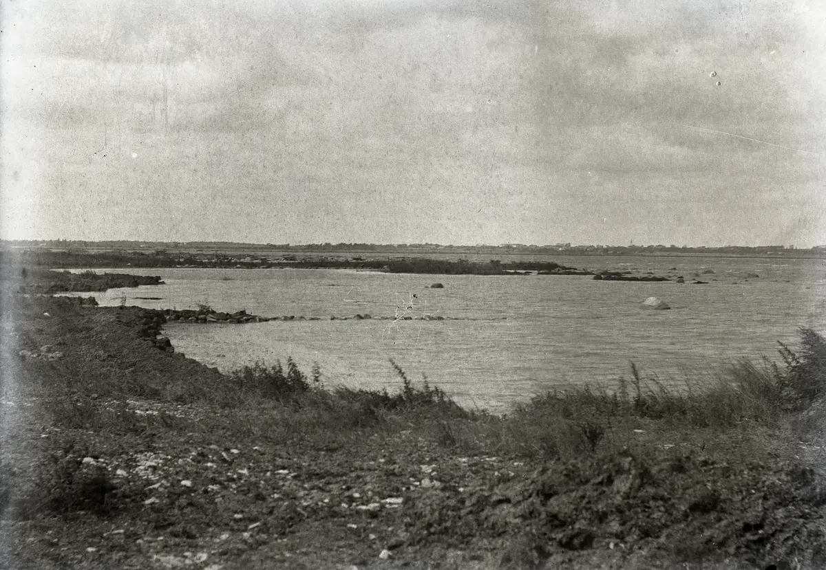Här ligger ett par små släkdöiar i förgrunden. Men den mesta släken ligger ännu i standskvalpet och har inte burits upp i döian på land. Bilden är tagen nedanför örnkull vid Nyen på När med utsikt över Lausviken och landet i Lau i bakgrunden.