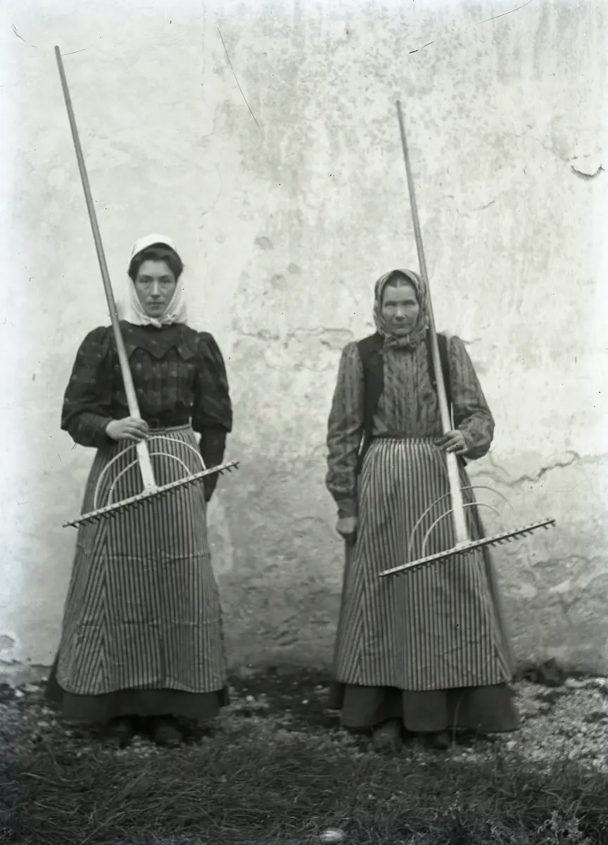 Det här är mera en porträttsbild än en arbetsbild, det är knappast något som skall räfsas i slutet av oktober! Dottern Emilie, 26 år, och modern Johanna Larsson, 50 år, står i bättre arbetskläder med dukar på huvudet hållande sina räivar, räfsor.