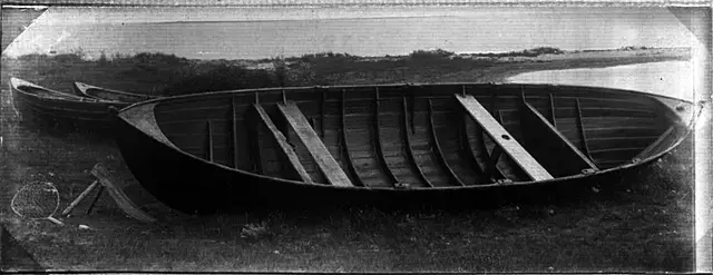 Även här visar Masse det invändiga i en fiskbat, tvåmänning. Hel- och halvrängarna, spanten, framträder tydligt. Man ser uttag för en mast i en aktre toft, samt kan ana ytterligare ett i den smala toften i fören.