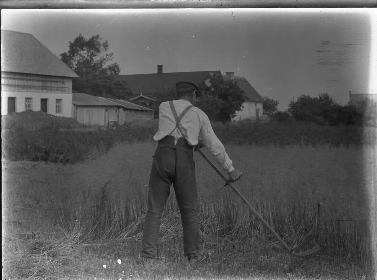 Här ses ett arbetsporträtt av Hallsarve Jakob Nilsson, 53 år, när han skär havre. Jakob har traditionella arbetskläder, dvs blus, byxor och den för Lau typiska höga vegakepsen.