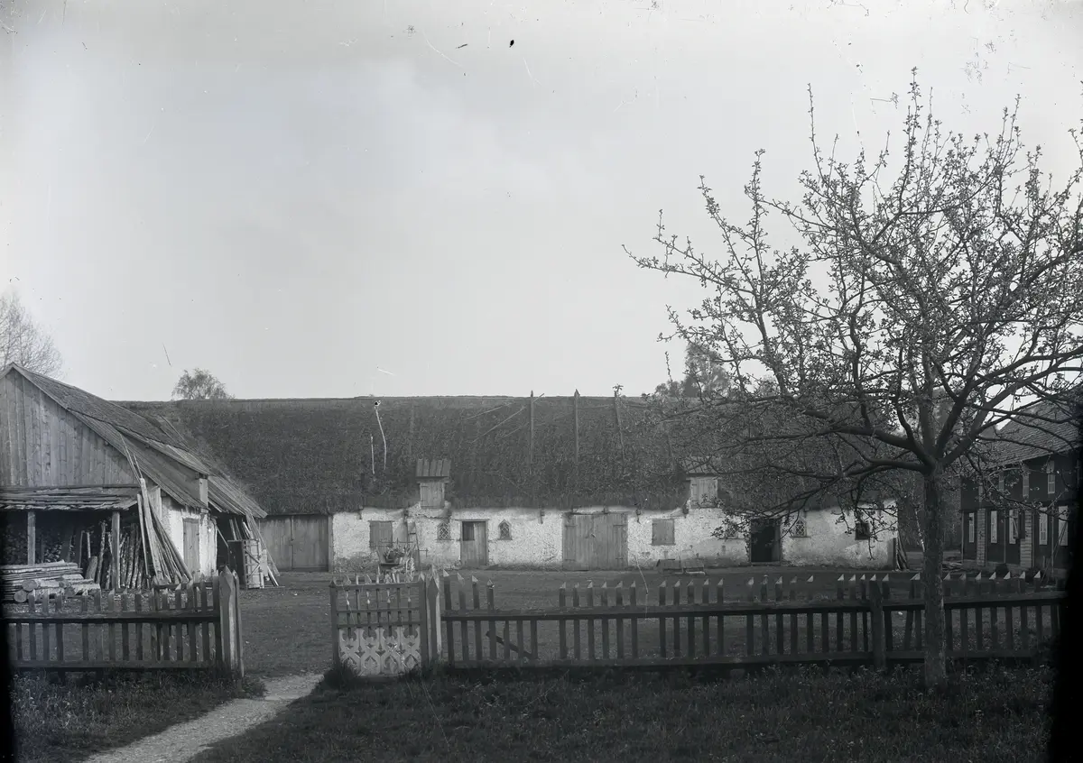 Masse har förevigat ladugården inne från lillgården. I förgrunden ser man spjälstaketet som börjar bli lite dåligt och en ovanligt välarbetad grind. Manbyggnad och ladugård stod med gavlarna mot vägen, tröskhuset t v hade således långsidan mot vägen. T h skymtar en troligen yngre bulbyggnad innehållande många funktioner.