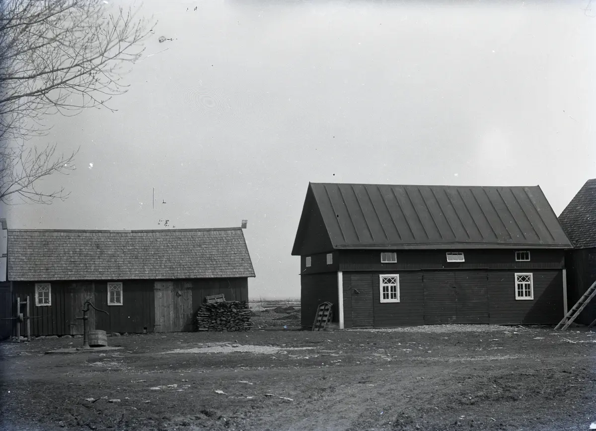 Byggnadstakten verkar ha varit hög på denna gårdspart och nya byggnader tillkom hela tiden. Här ses en vedbod i resvirke under spåntak, den har två avdelningar och innehåller troligen någon mer funktion än vedbod. Till höger står ett påkostat sädesmagasin med liggande panel och papptak, rödmålat med vita knutar och fönster.