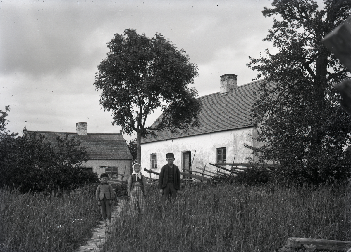 På bilden ser vi från väster: Harald Hansson 7 år, Hermanna Hansson 10 år, hon blev 101 år gammal, och Henrik Hansson 15 år. I bakgrunden ser vi manbyggnaden, en parstuga från 1800-talets första hälft och brygghuset.
