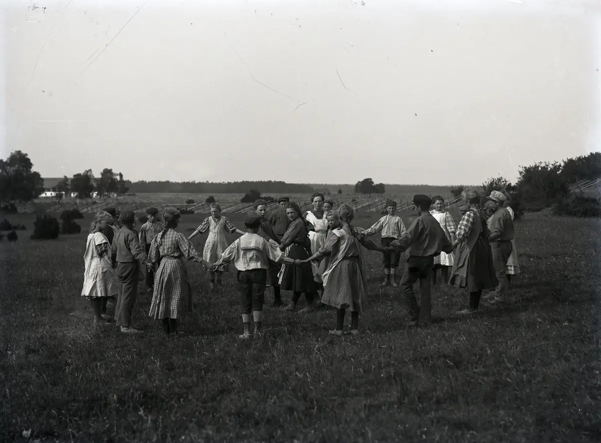 Det verkar som om leken här liksom på Bild 505, 506, 508, 509 och 510 är på temat kärlekspar. Här leker man på skolavslutningsdagen (?) i en hage troligen under backen några hundra meter norr om kyrkan med Hallbjäns utskiftade gårdsparts rätt nya ladugård i bakgrunden.