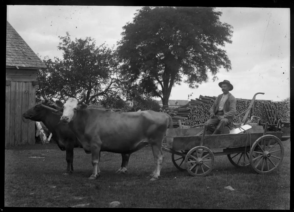 Alfred kör tvåspann med stutar spända framför skvackvagnen, den gängse arbetsvagnen på den tiden. Mot vedtraven står järnharven.