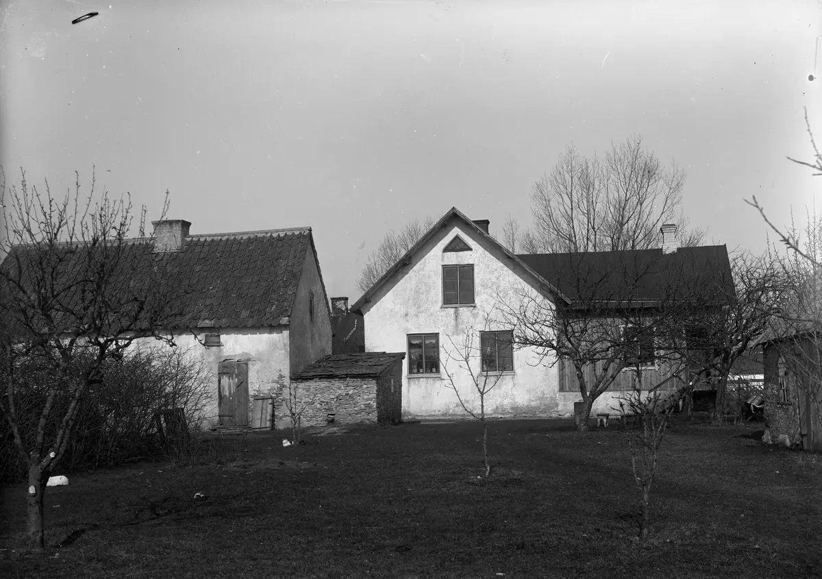Denna soliga vårförmiddag har Masse avbildat manbyggnaden och brygghusflygeln. Han har ställt sig så att den andra flygelns skorsten syns mellan byggnaderna. Längst till höger skymtar smedjan. Här ser man att manbyggnaden är ganska smal och saknar sockel. Det skulle kunna innebära att den är äldre än tidigare angivits och vara byggd av av Johan Mattsson när denna part etablerades omkring 1830. På Gardells tid kan huset ha moderniserats genom att höjas, få tidsenliga fönster och utdraget tak. Köksbakbygget med vardagsingång uppförde säkerligen Nilssons.