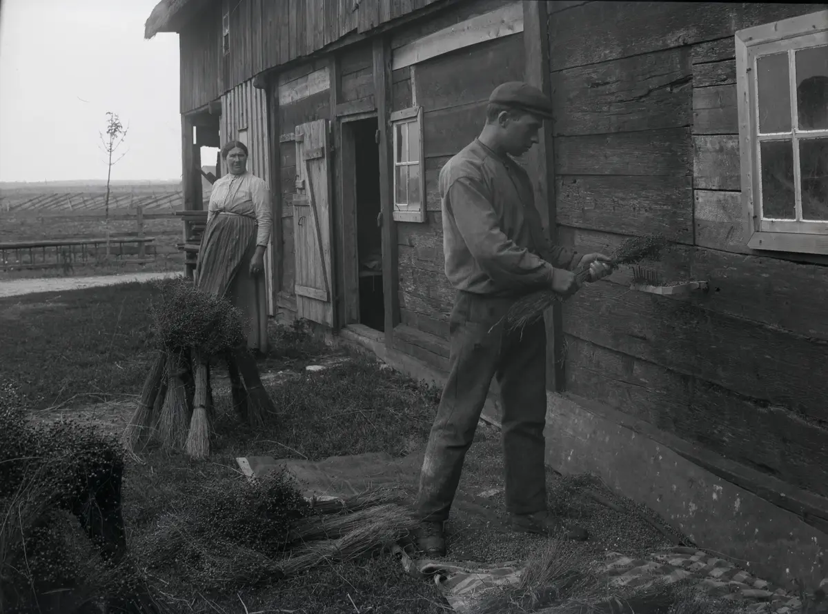 Hallsarve Alfred Mårtensson, 23 år, drar av linets fröhus vid en på ladugårdsväggen uppsatt ...?, där fröhusen fastnar mellan spikar. Arbetet övervakas av modern Anna Mårtensson, 55 år.