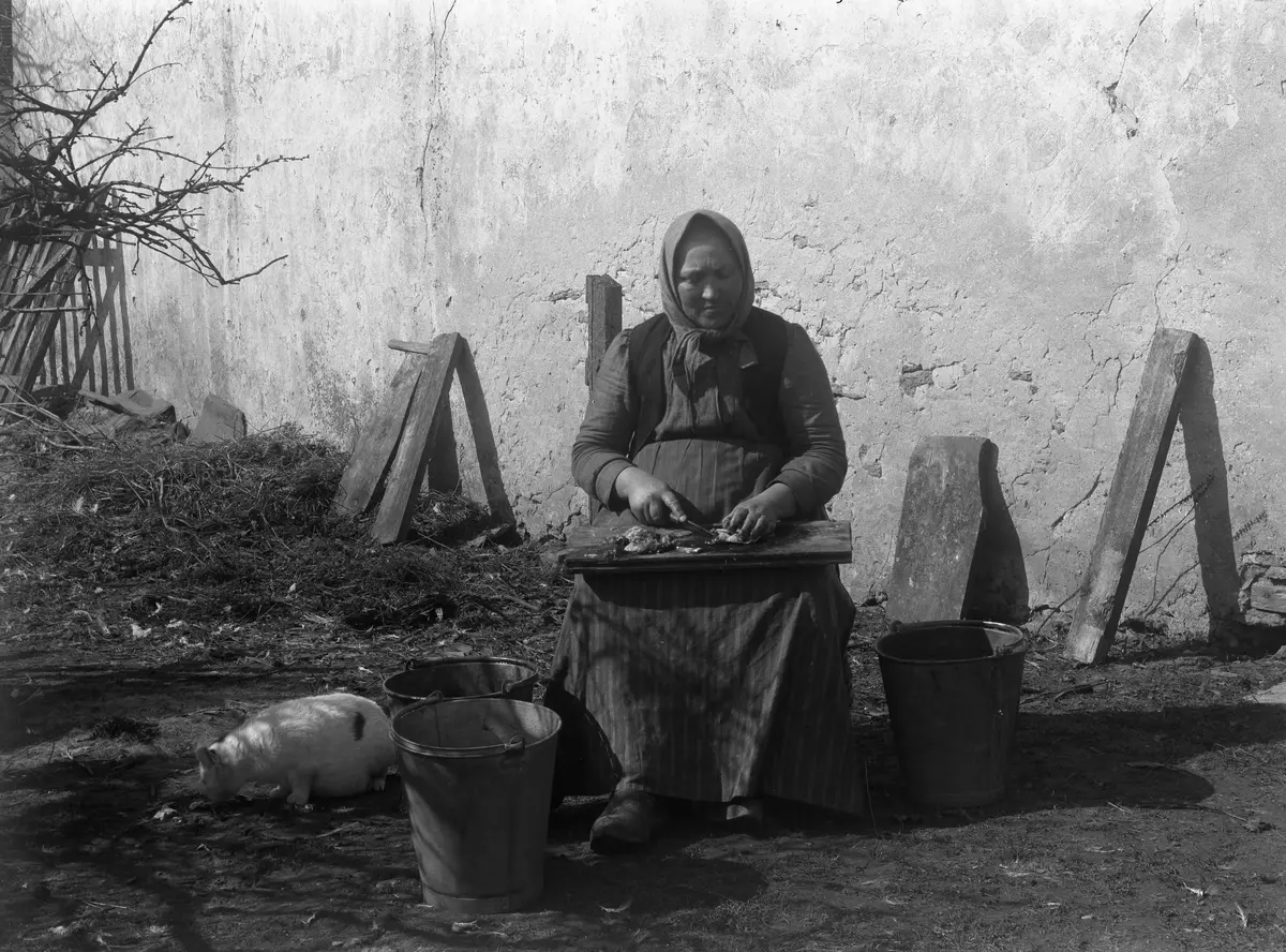 Hallsarve Josefina Nilsson, 50 år, sitter med skärbrädan i knäet och rensar flundror. Hon skar av huvudet, fenorna och tog ur inälvorna, vilka katten kalasar på. Flundrorna flåddes i regel aldrig, utan man åt upp skinnen, även det hårda och sega ryggskinnet. Flundrorna stektes färska, men fick man mycket så saltades de in och koktes sedan.