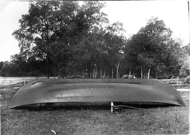 Grannarna på Smiss Artur Karlsson och Vilhelm Karlsson (de var inte släkt) har byggt en ovanligt stor fiskebåt, tvåmänning, tillsammans. Här ligger den nytjärad utanför Vilhelms 8 år gamla ladugård. Masse har varit noga med att på fyra bilder visa båtens form.