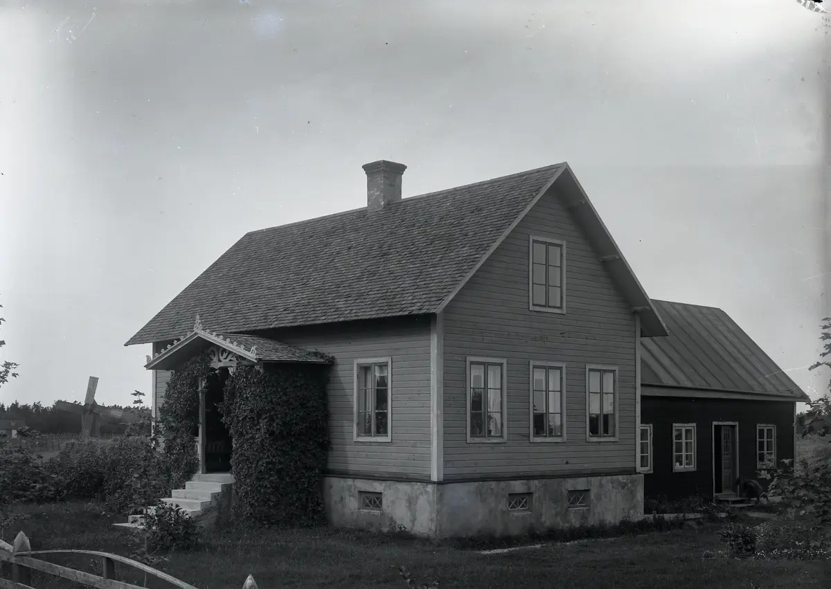 Här ser man hur det moderna huset har en källare med fönster! Bakbygget med brygghus är byggt 1911, men kan åtminstone delvis bestå av äldre delar. I bakgrunden skymtar Bönde kvarn.