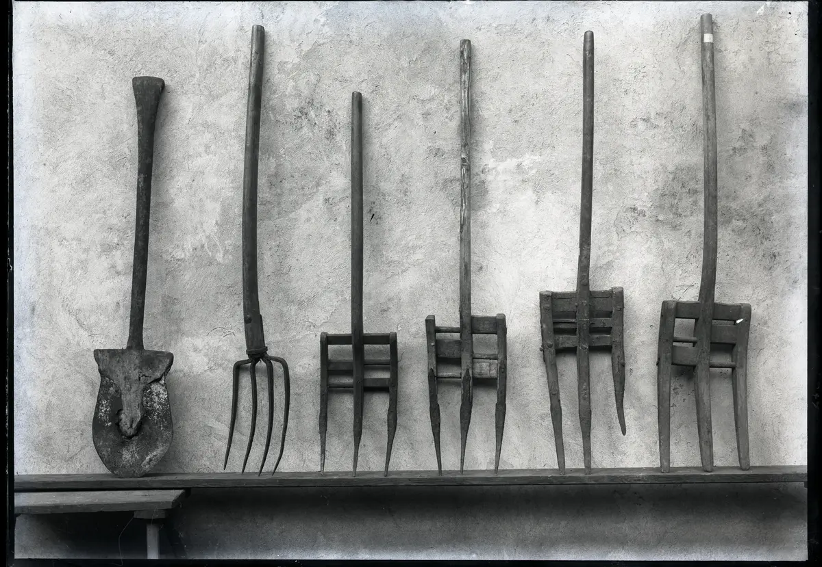 En typisk massebild, där man direkt lägger märke till hans pedagogiska förmåga: han ställer upp 6 redskap på jämna avstånd på en bräda mot en vägg, så de tydligt framträder. Han vill så tydligt som möjligt visa hur redskapen ser ut.