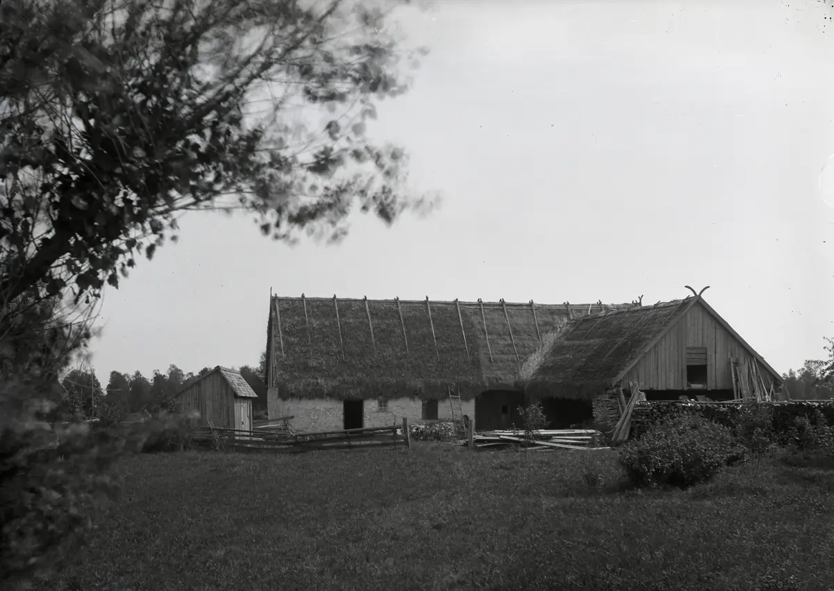 Denna vackra sommardag tar Masse flera bilder i Botelsgrannlaget, bl a denna från Bodins ladugård. Här ser vi en fähusdel med hoimd, hörum i sten under agtak och en laddel i bulteknik med framförvarande tröskhus, båda under halmtak. Stora flovedstravar står framför tröskhuset, en hög med trolar, gärdsel eller tvaitar, bakar ligger bredvid, samt en hög huggen ved framför hoimdluckan. Till vänster står ett dass med oregelbundet takfall. Stigen ut till ladugården går troligen bakom busken t h.
