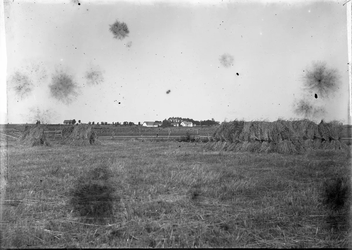Man undrar om de fåtaliga rakarna med rågskupor är det väsentliga i Masses motivval. Snarare kan man tro att det är landskapet med Bjärges västra part, Arvid Danielssons, i bakgrunden. Från vänster ser man Bjärges stolpkvarn, fribaptistkapellet, klappade askar längs Bjärgeskvior med möjligen stentunen framför, Arvid Danielssons gård där ladugården ännu har agtak, ladugårdsflyglar,manbyggnadens flygel, manbyggnaden med bakbygge och alldeles inpå smedjan innan den flyttades utanför tomten. De höga träden står i den s k Melanderska lunden. Bjärges norra och östra gårdsparter döljs av raken t h.