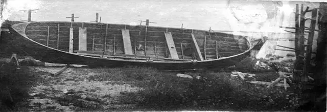 Masse har lagt ner storbåten, tremänningen, på sidan, så man skall kunna se hur den ser ut inuti. Man ser hel- och halvrängarna, spanten, som håller ihop borden. Tofterna sitter i stort sett i. Ett uttag för en mast syns tydligt i aktre delen av båten. Ett främre skymtar i den smala toften, troligen fäste man masten med en bygel mot toften. Båten har 4 par roningar, årtullar.