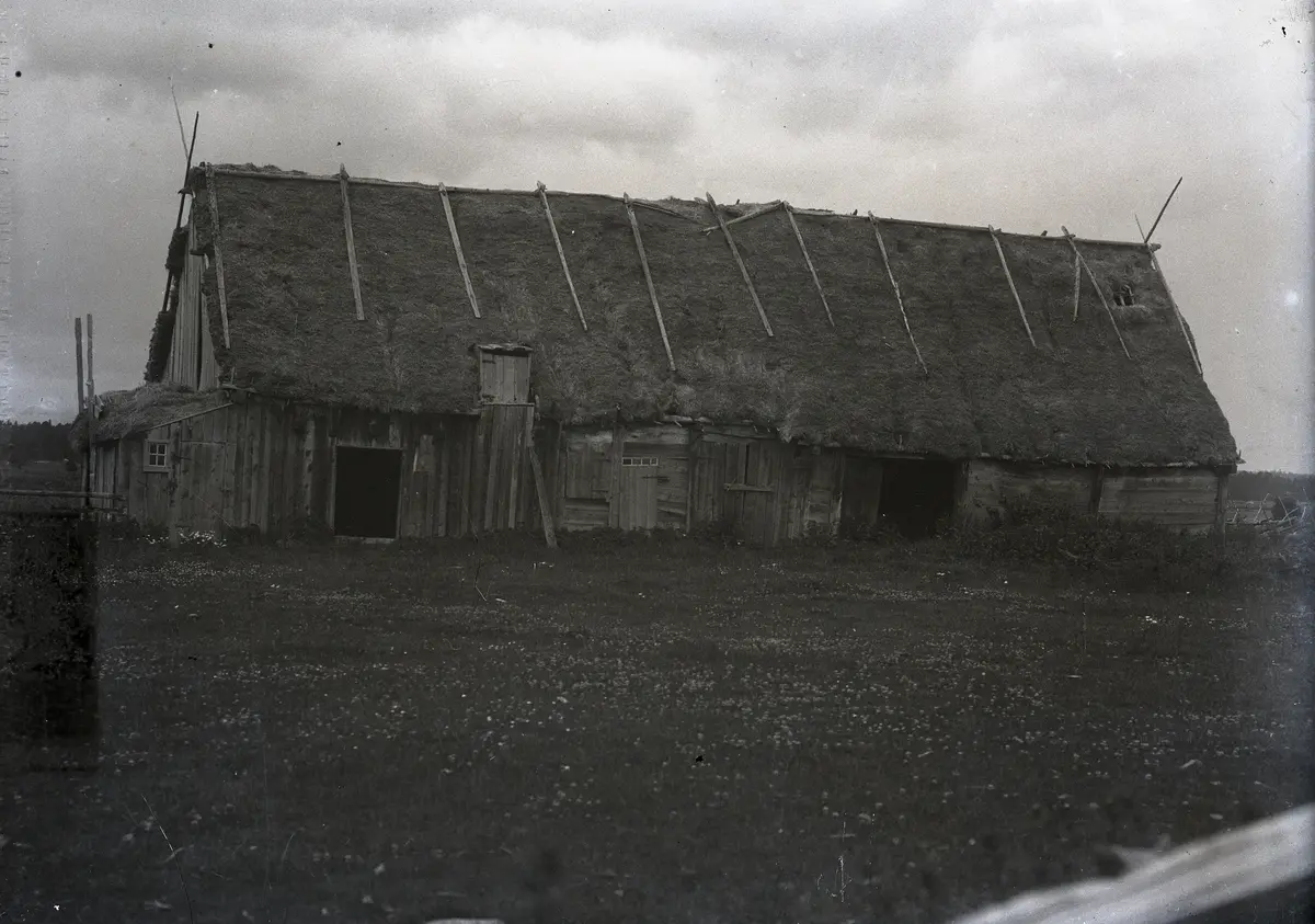 Masse har gått ut på åkern nedanför och tagit en bild av baksidorna på Södergrens och Hallgrens bostadshus. På Södergrens hus har man ännu inte hunnit bygga glasverandan i vinkeln. En gammalmodig bulbod under faltak har flyttats hit. Hos Hallgrens ser det ut som en bakugn sticker ut genom väggen på bostadshusets bakbygge. Det lilla skjulet i resvirke är nog ett dass.